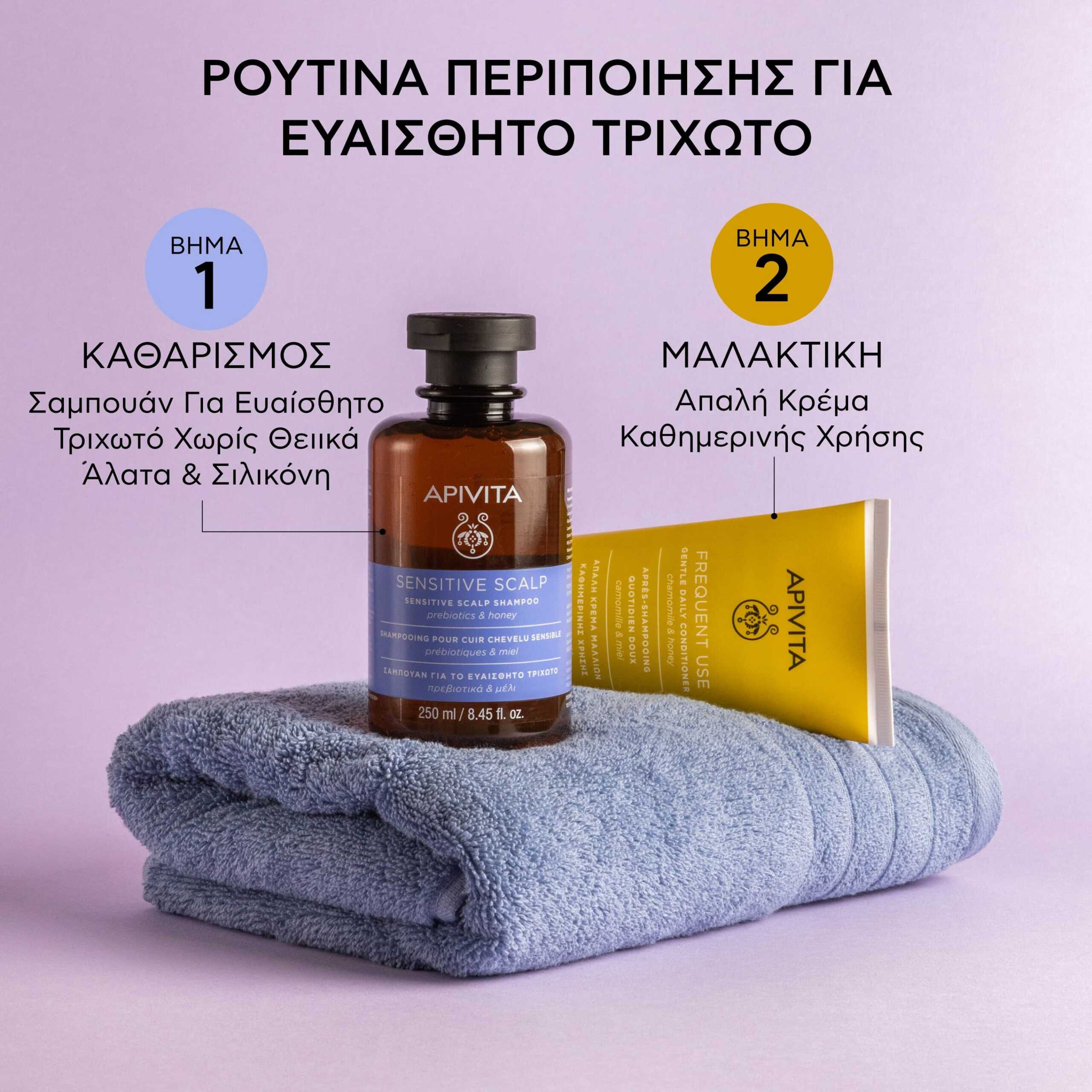 Το ευαίσθητο και ερεθισμένο τριχωτό θέλει ιδιαίτερη φροντίδα, χρειάζεται σεβασμό, ενυδάτωση, απαλό καθαρισμό. Το σαμπουάν για το Ευαίσθητο Τριχωτό με πρεβιοτικά και μέλι της APIVITA:
