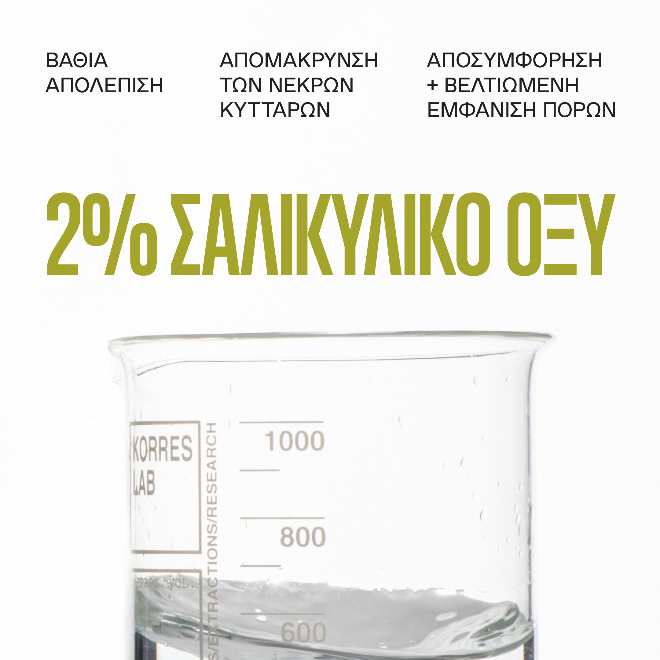 - 2% σαλικυλικο οξυ (BHA): απολεπίζει και καθαρίζει σε βάθος τους φραγμένους πόρους