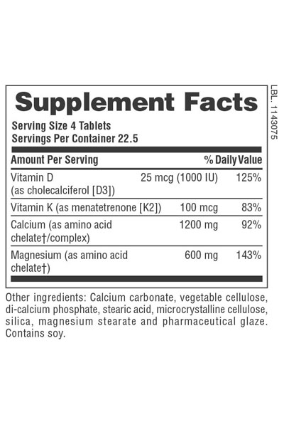 1200 mg, 600 mg, 1000 IU, 100 mcg, αντίστοιχα οι 4 ταμπλέτες. Η πρωτοποριακή αυτή φόρμουλα, λόγω της αυξημένης ενεργότητας των Βιτ. D3 (cholecalciferol) και Κ2 (menatetrenone), παρέχει αυξημένη απορρόφηση και εναπόθεση των μεταλλικών στοιχείων στα οστά, ενισχύοντας της οστική πυκνότητα.Το ασβέστιο, το μαγνήσιο και οι βιταμίνες D3 και K2 είναι ζωτικής σημασίας για το σχηματισμό γερών οστών και δοντιών. Επίσης είναι απαραίτητα για την υγιή λειτουργία του ανοσοποιητικού συστήματος.