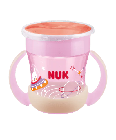 Το NUK Mini Magic Cup επιτρέπει ακόμη και στα πιο μικρά παιδιά να πίνουν όπως τα μεγαλύτερα. Το περιμετρικό χείλος εκμάθησης 360°υποστηρίζει και μαθαίνει στο μωρό σας να πίνει από όλες τις πλευρές, σαν να πίνει από κανονικό ποτήρι. Η «μαγική» διαφορά: το ποτηράκι αποτρέπει τις διαρροές, χάρη στον δίσκο σιλικόνης που σφραγίζει το καπάκι από μέσα. Έτσι, το να πίνουν γίνεται παιχνιδάκι για τα παιδιά: το παιδί σας αρκεί να ασκήσει πίεση με το στόμα στο χείλος του ποτηριού.